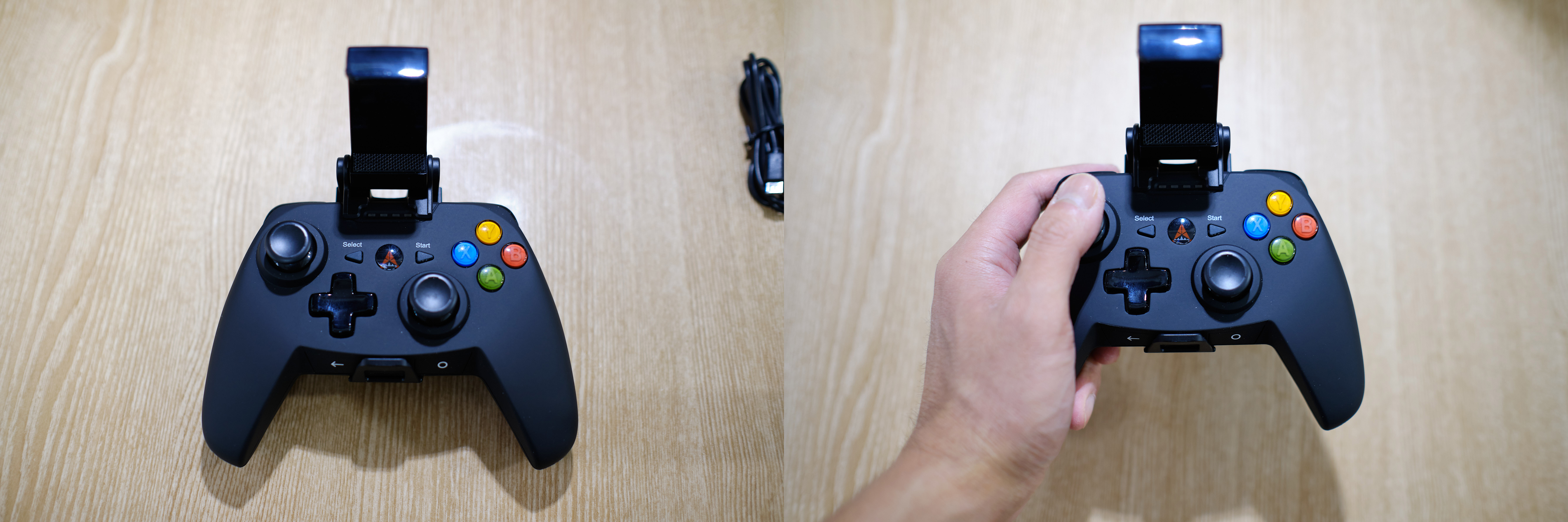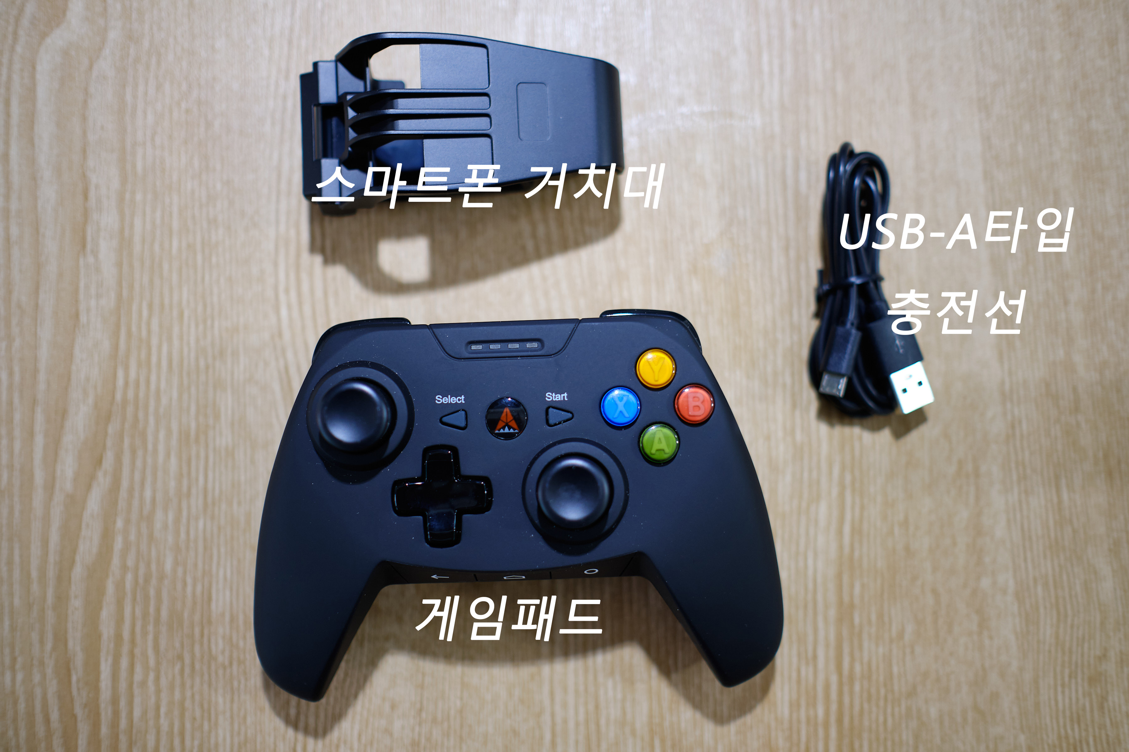 구성은 게임패드, 스마트폰 거치를 위한 거치대, 그리고 충전을 위한 케이블이 들어 있습니다.